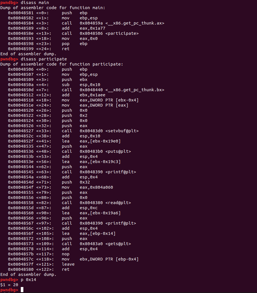 participate 함수에서 gets로 ebp-0x14부터 입력을 받으니