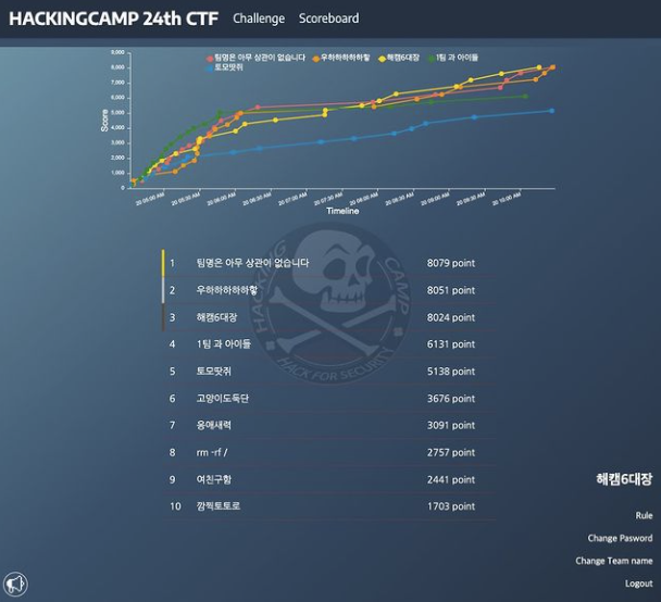 24회 해킹캠프 CTF에 해캠6대장이라는 팀으로 참여 했다.
